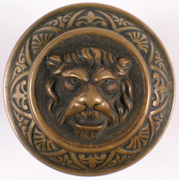 Construction: 1 part cast Surface Texture: Surface Color/Finish: Bronze Ornament: Cast - high relief Design Name: Lion School: Representational Remarks: VDA Classification: Group & No: Comment: Catalog : Company Name: Russell & Erwin Mfg. Co. Date: 1869 ? Material: Metal - Bronze Manufacturing Method: Cast