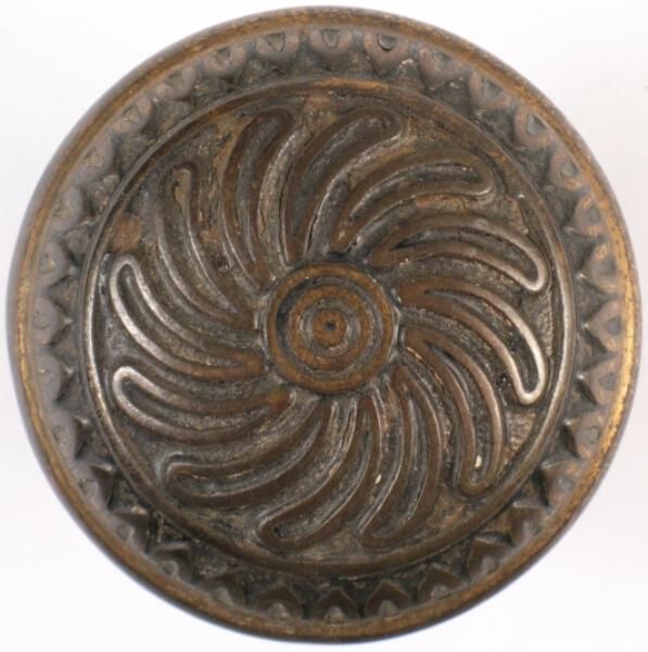 Construction: 2 part Surface Texture: Surface Color/Finish: Iron / Bronze finished Ornament: Resembles earth - Lockwood type Design Name: School: Remarks: Spiral design VDA Classification: Group & No: E 125 Comment: Catalog : Company Name: Date: 1890 Material: Metal - iron Manufacturing Method: Cast - bead cast over