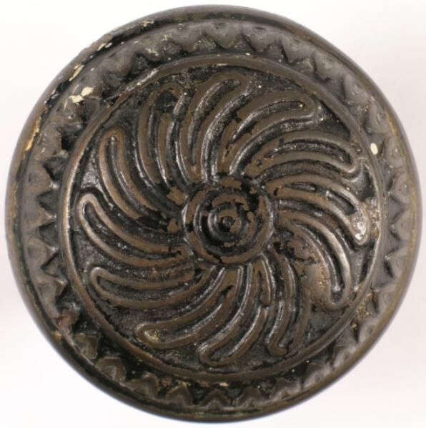 Construction: 2 part Surface Texture: Surface Color/Finish: Iron / Bronze finished Ornament: Resembles old Lockwood Design Name: School: Remarks: Spiral design VDA Classification: Group & No: E 125 Comment: Catalog : Company Name: Date: 1890 Material: Metal - iron Manufacturing Method: Cast - self bead