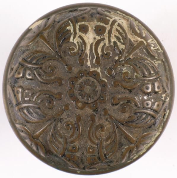 Construction: 2 part cst - ringed Surface Texture: Surface Color/Finish: Bronze Ornament: Cast Design Name: School: Renaissance Remarks: Ringed with bronze bead VDA Classification: Group & No: H 204 Comment: Catalog : Company Name: Date: c. 1880 Material: Cast bronze Manufacturing Method: Cast