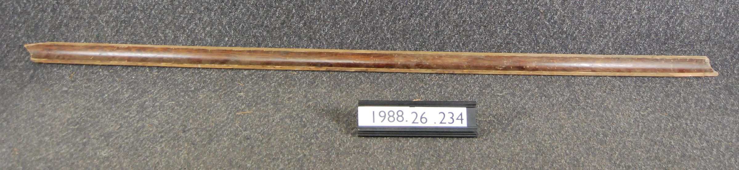 Interior wood molding (cove). Made of soft wood. Varnished. Has same finish as 1988.26.233. Type: Inscriptions or Markings: Manufacturer: Place of Manufacture: Design motif: Style: Finish: Varnished