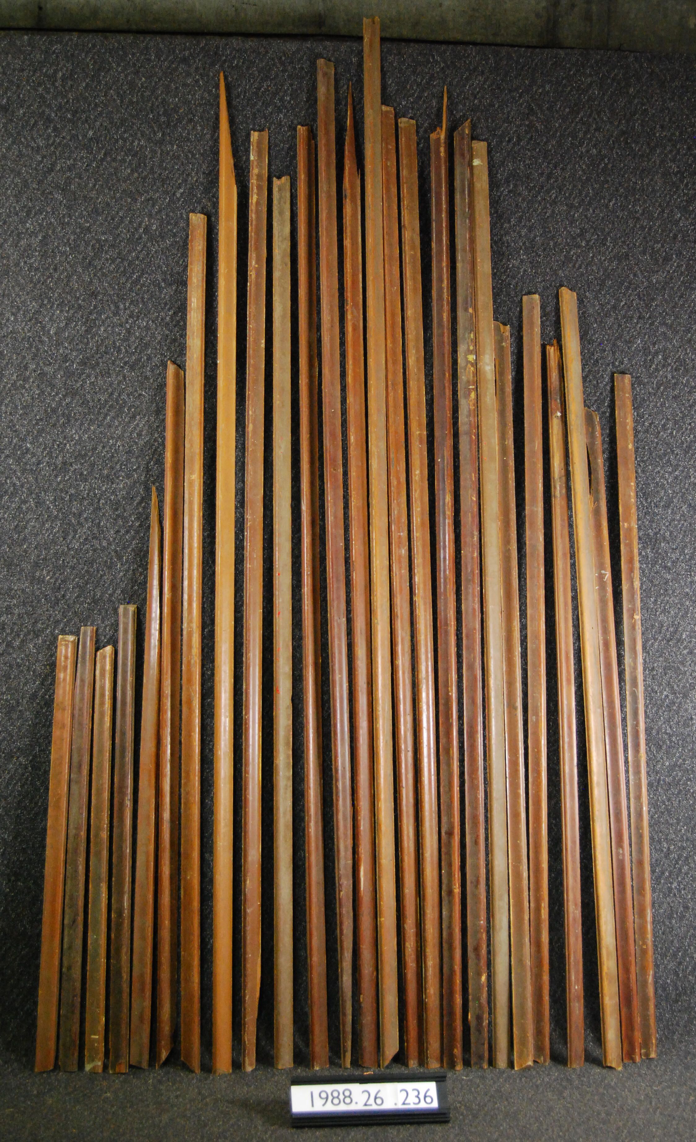One lot of twenty-five interior wood moldings Made of soft wood. Varnished. Type: Inscriptions or Markings: Manufacturer: Place of Manufacture: Design motif: Style: Finish: Varnished