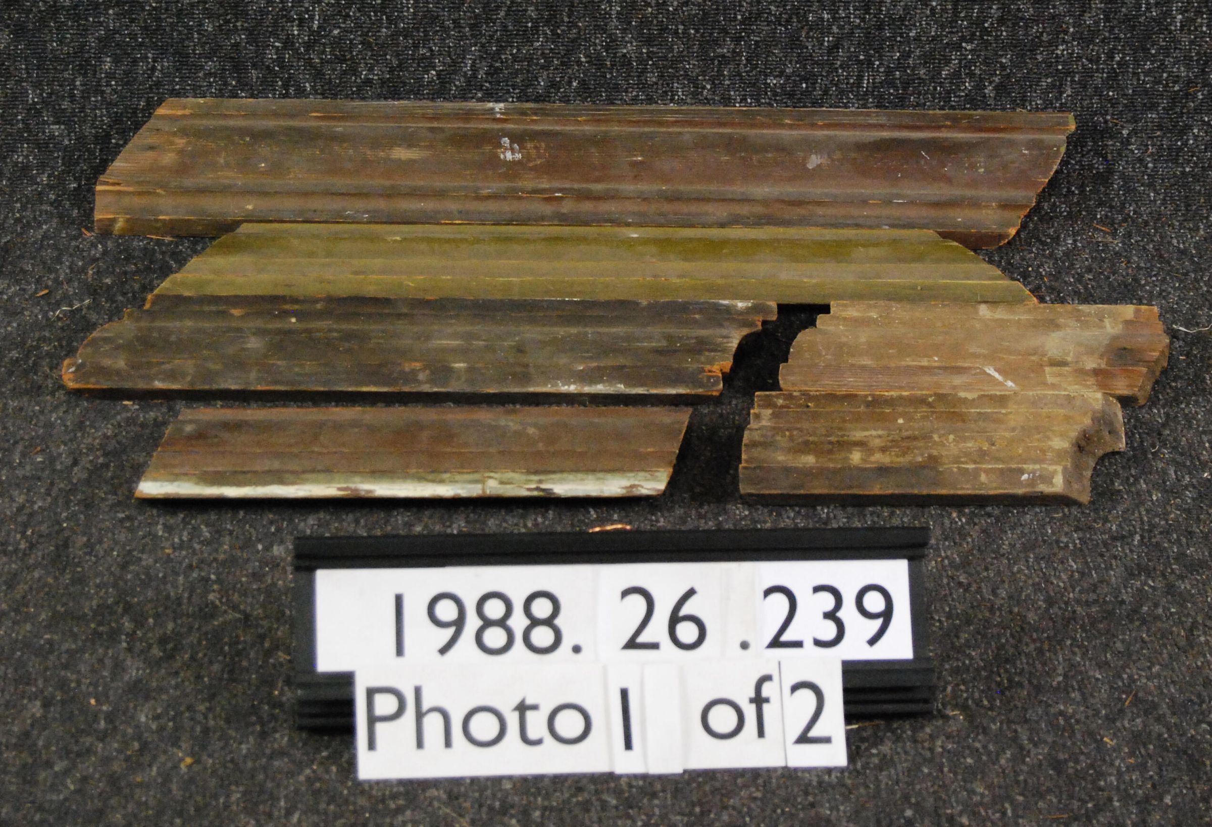 One lot of twenty-one interior wood moldings. Made of soft wood. Varnished. (One short piece refinished). Type: Inscriptions or Markings: Manufacturer: Place of Manufacture: Design motif: Style: Finish: Varnished. (One short piece refinished).