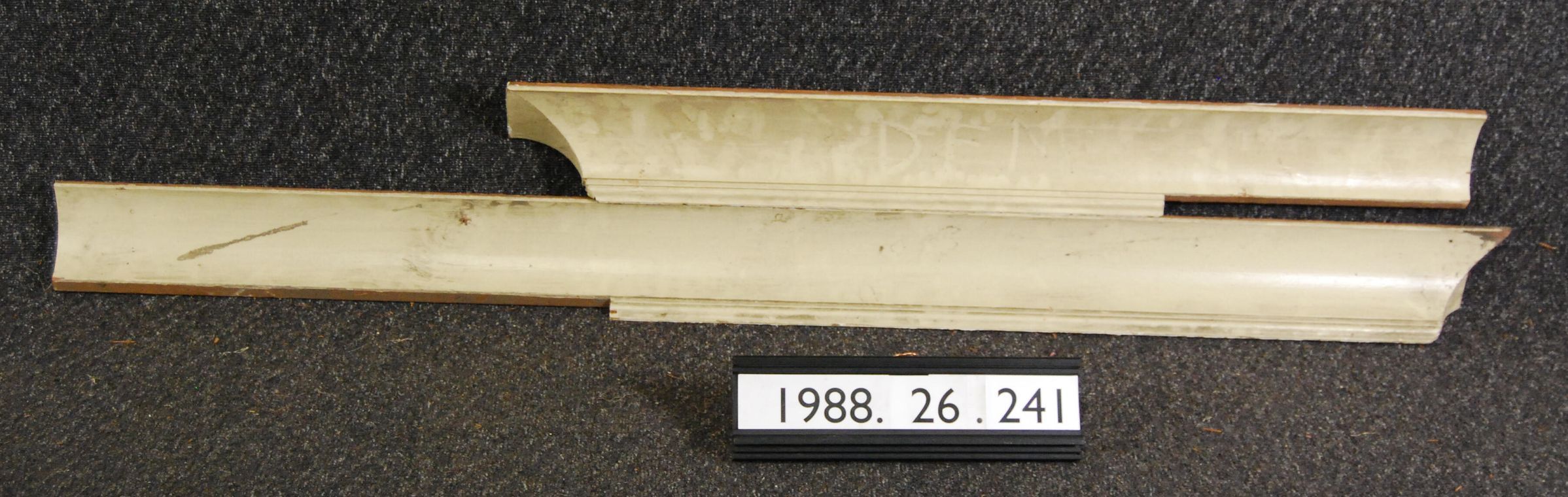 One lot of two interior wood moldings (cove). Each has return at one end. Made of soft wood. Painted white. Type: Inscriptions or Markings: Manufacturer: Place of Manufacture: Design motif: Style: Finish: Painted White