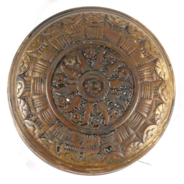 Construction: 3 part, cast bronze Surface Texture: Surface Color/Finish: Aged/unpolished Ornament: Design Name: Basket weave School: Remarks: Front is detatched. See 1988.3.445.1 matching escutcheon. VDA Classification: Group & No: D-111 Comment: Catalog : Company Name: Hopkins & Dickinson Date: c. 1883 Material: Cast Bronze Manufacturing Method: Cast 3 part