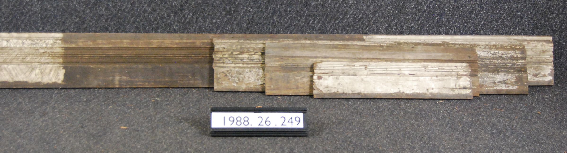 One lot of eight interior wood baseboard moldings. One piece is truncated along edge. Made of soft wood.Originally varnished. Now painted cream colored.