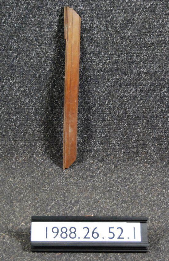 Interior wood molding. Possibly transom window casing. Made of unidentified wood. Varnished. Associated with 1988.26.52. Type: Inscriptions or Markings: Manufacturer: Place of Manufacture: Design motif: Style: Finish: Varnished