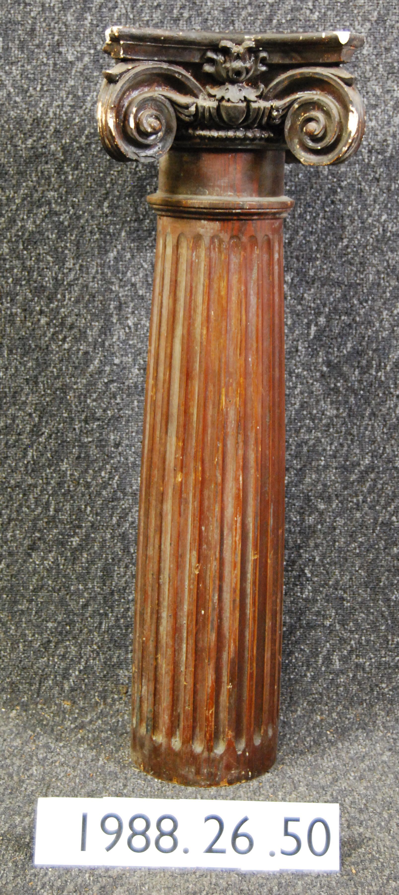 Classical revival style tapered wood fluted column (varnished) with astragal near top. Has plaster capital (painted brown).