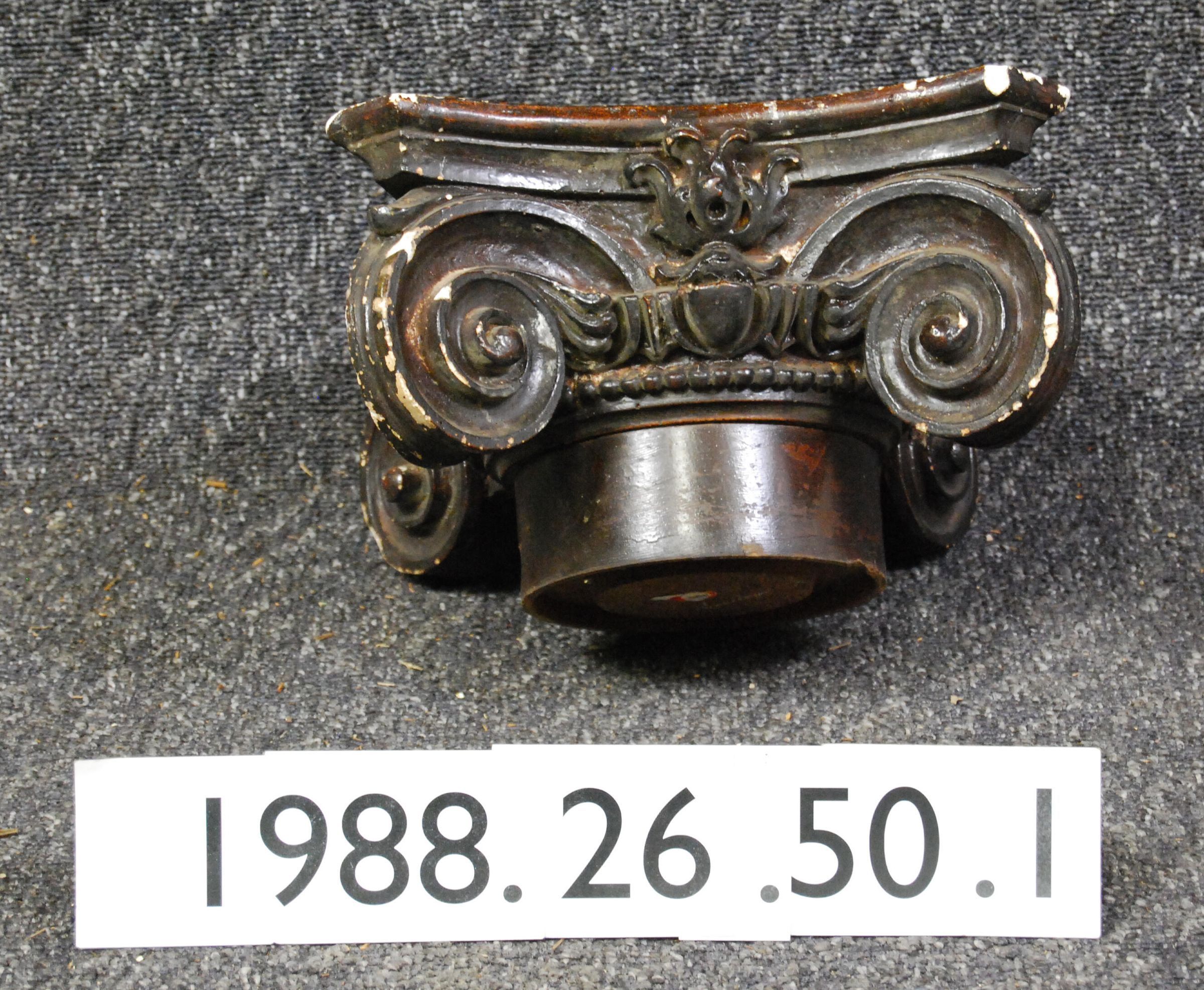Classical revival Ionic style capital. Made of plaster. Mounted on cylindrical wood column section (incomplete). Painted brown. Type: Inscriptions or Markings: Manufacturer: Place of Manufacture: Design motif: Style: Finish: Painted Brown