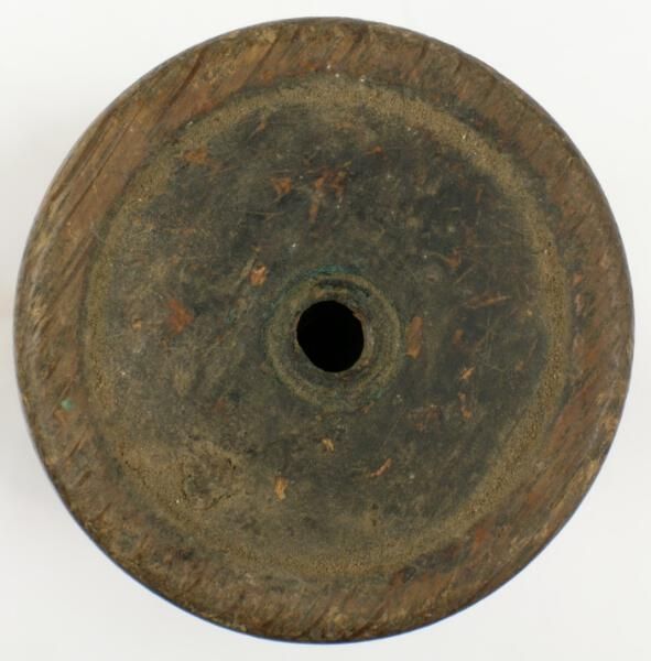 Construction: Turned Surface Texture: Surface Color/Finish: Black paint Ornament: Design Name: School: Remarks: Missing bolt goes through face to patented spindle VDA Classification: Group & No: Comment: Catalog : Company Name: Date: Material: Wood, iron neck Manufacturing Method: Turned
