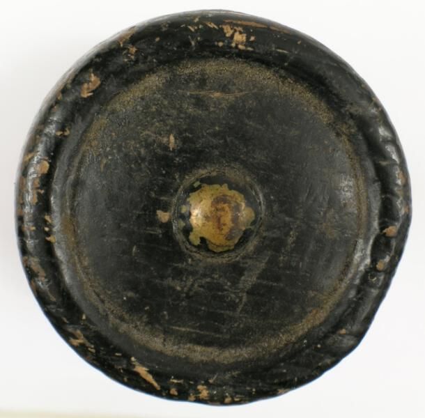 Construction: Turned Surface Texture: Surface Color/Finish: Black paint Ornament: Design Name: School: Remarks: Bolt goes through face to patented spindle VDA Classification: Group & No: Comment: Catalog : Company Name: Date: Material: Wood, iron neck Manufacturing Method: Turned