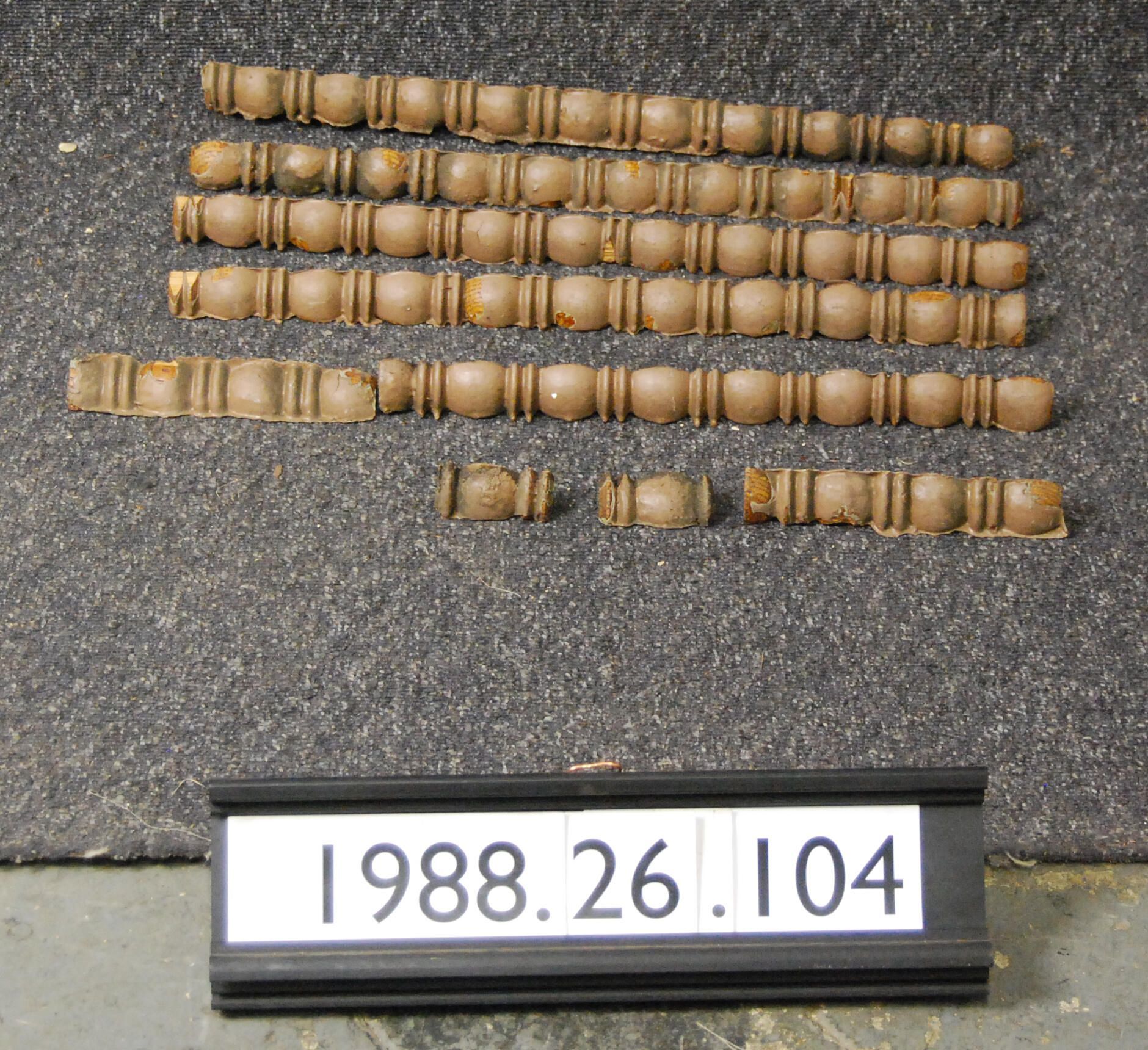 One lot of nine interior wood moldings. Turned and quartered. Made of oak. Originally vanished - now painted brown.