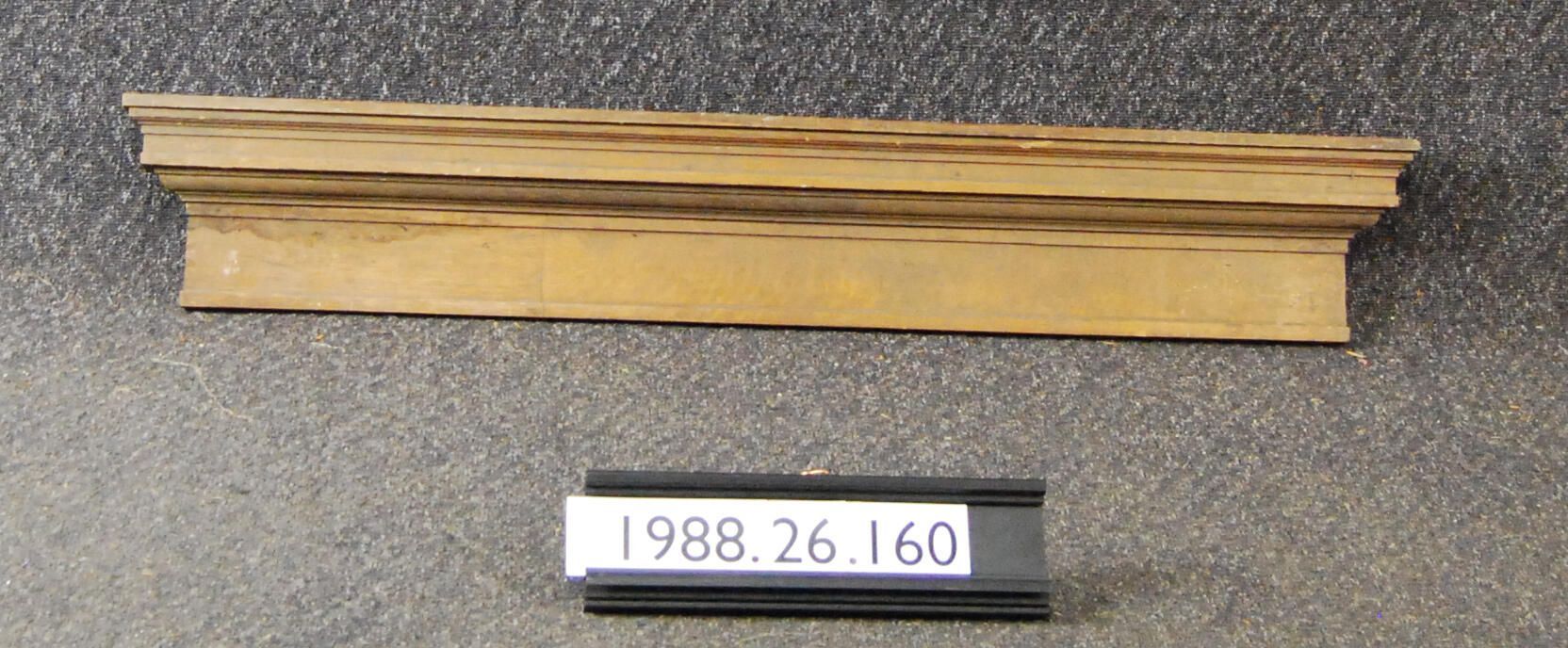 Interior wood molding. Built-up from multiple parts. Has crest molding, below which is plain frieze. Probably served as window or door header. Made of white oak; secondary softwood backing. Varnished. Associated with 1988.26.97 - casing.