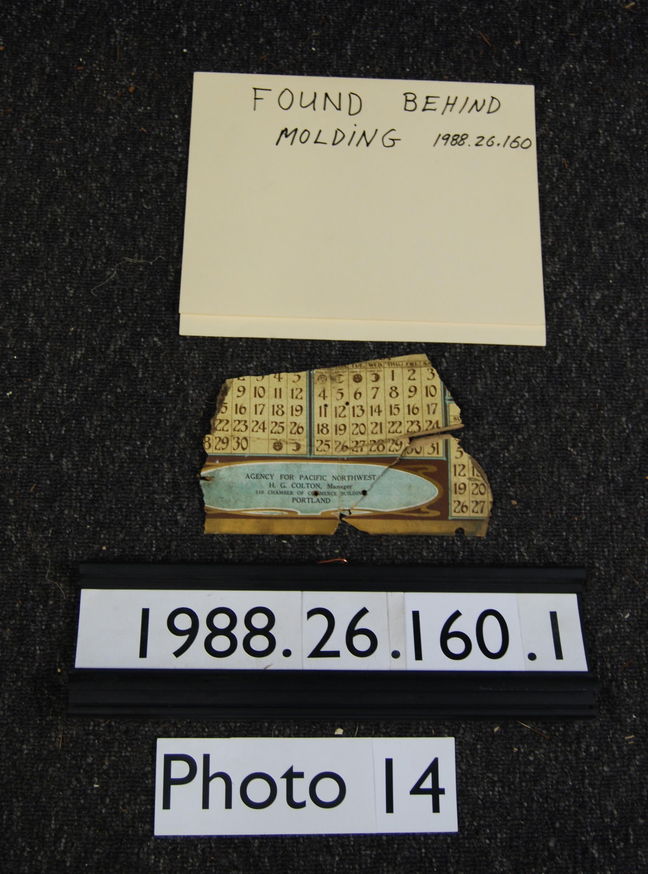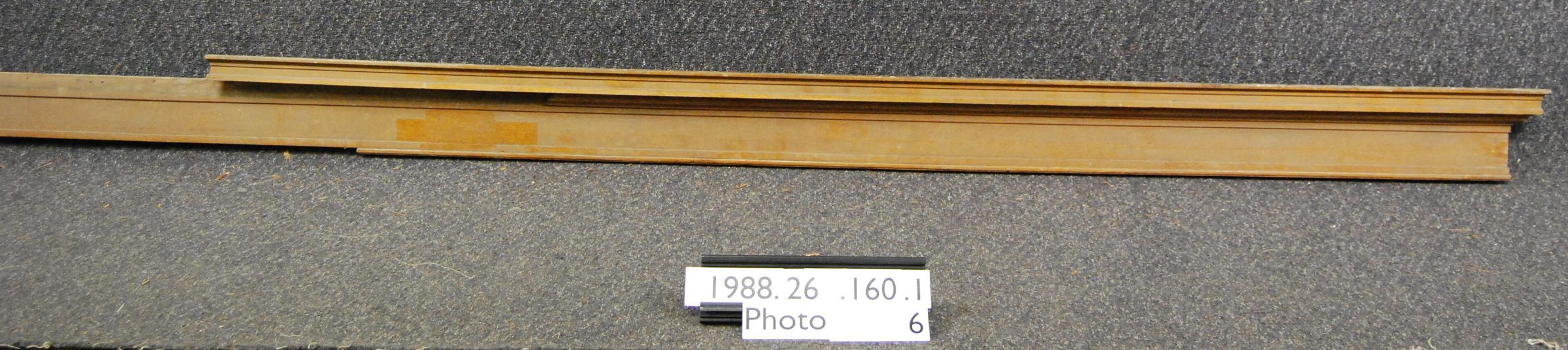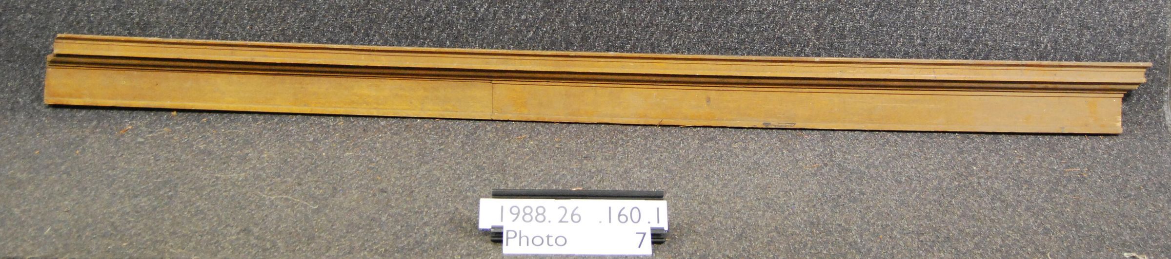 One lot of thirteen interior wood moldings. Built-up from multiple parts. Each has crest molding, below which is plain frieze. Used as horizontal trim. Made of white oak - secondary wood is soft wood - at least one piece of other hard wood. Varnished. Associated with 1988.26.97 - casing.