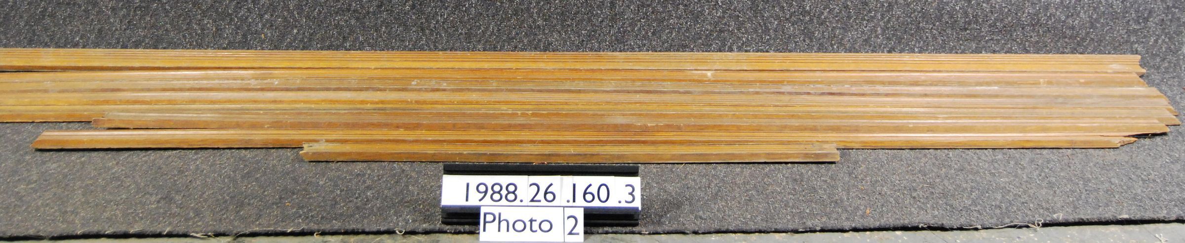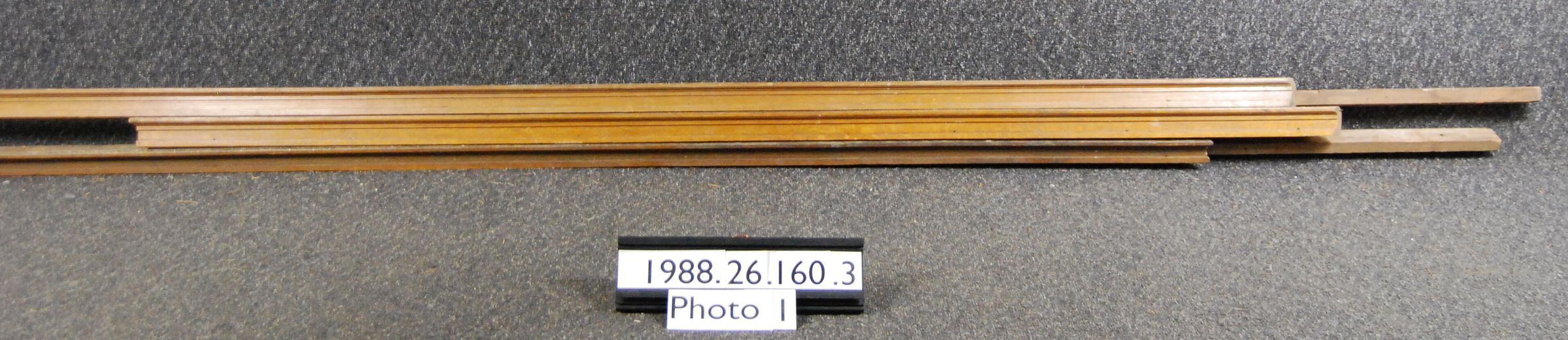 One lot of twelve interior wood moldings. Upper-most (Crest) molding only. Lower portions missing. Measurement does not include backing. Made of white oak. Three pieces have soft wood backing strips. Varnished. Associated with 1988.26.97.
