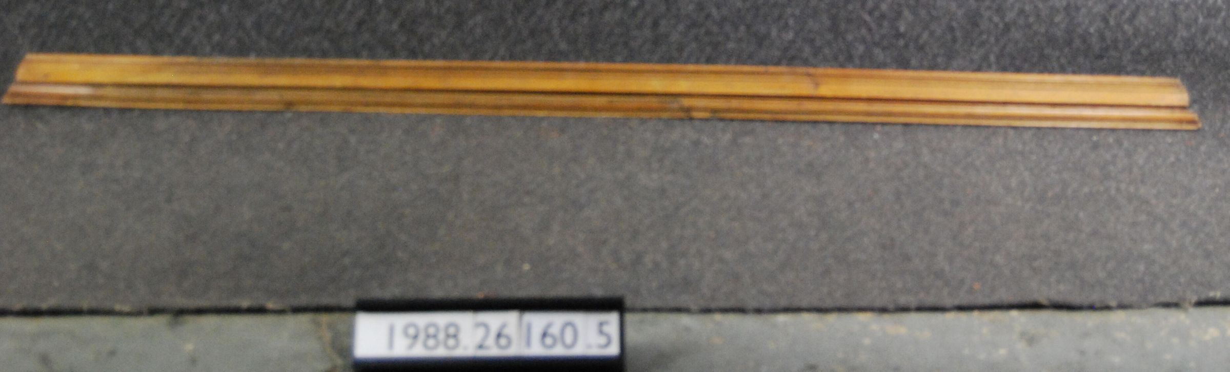 One lot of four interior wood moldings. Originally designed WITHOUT lower frieze board. Soft wood backing strips. Made of white oak. Varnished. Associated with 1988.26.97 - casing.