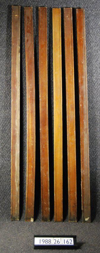 One lot of six interior wood moldings (door or window casings). Made of white oak. Varnished. Possibly associated with 1988.26.161? Type: Inscriptions or Markings: Manufacturer: Place of Manufacture: Design motif: Style: Finish: Varnished