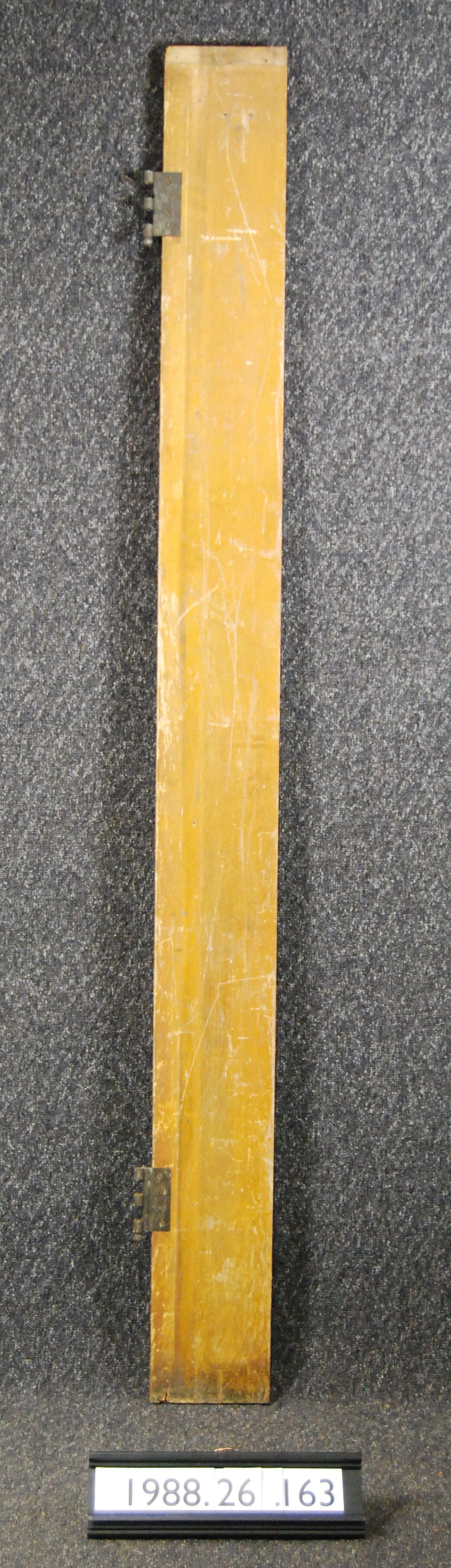 Interior wood door frame component. Has two attached iron hinge leaves. Jamb strip is missing. Made of oak, varnished.