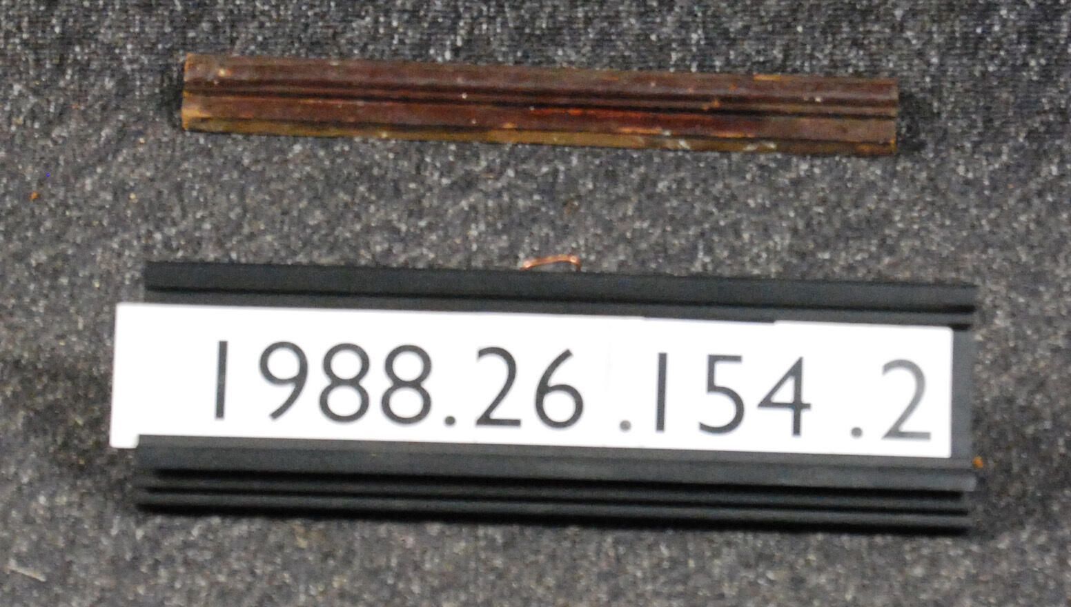 Interior wood trim. Comprised of truncated board with attached molding,. Same finish as 1988.26.154. Made of softwood. Varnished.