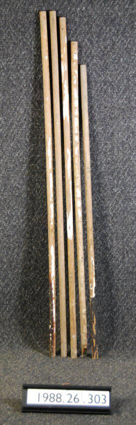 One lot of five interior wood corner trim pieces. One is truncated at one end. All made of soft wood. All with remnants of paint / varnish.