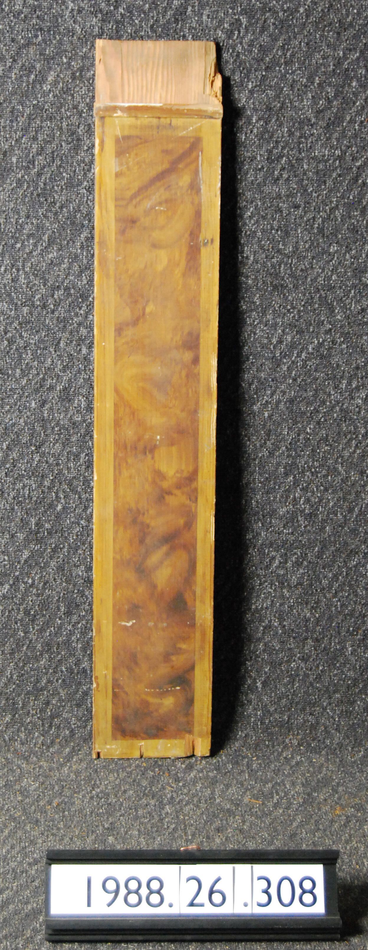 Interior wood board. Made of soft wood - probably Douglas Fir. Painted faux wood grained to simulate panel.. Type: Inscriptions or Markings: Manufacturer: Place of Manufacture: Design motif: Style: Finish: Painted Faux-Wood Grained