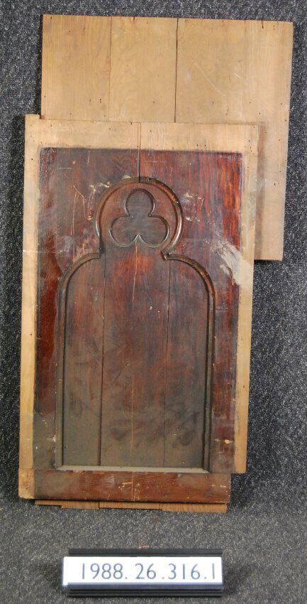 Interior wood panel. Originally part of church choir screen. Gothic revival style. Recessed panel with trefoil. Made of Douglas Fir. Varnished. Type: Inscriptions or Markings: Manufacturer: Place of Manufacture: Design motif: Style: Gothic Finish: Varnished