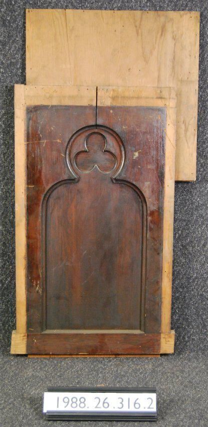 Interior wood panel. Originally part of church choir screen. Gothic revival style. Recessed panel with trefoil. Made of Douglas Fir. Varnished. Type: Inscriptions or Markings: Manufacturer: Place of Manufacture: Design motif: Style: Gothic Finish: Varnished