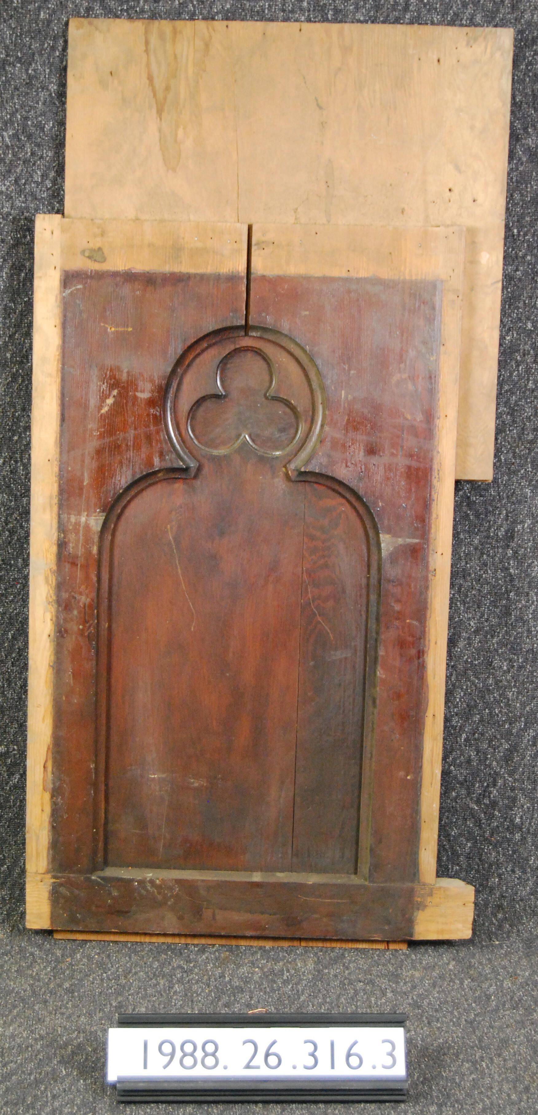 Interior wood panel. Originally part of church choir screen. Gothic revival style. Recessed panel with trefoil. Made of Douglas Fir. Varnished.