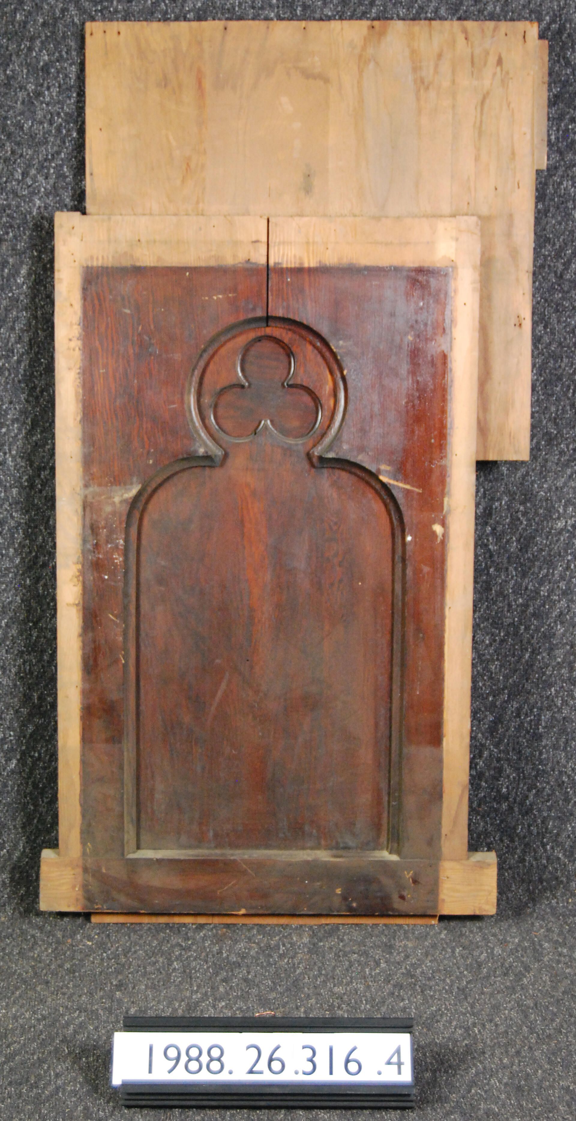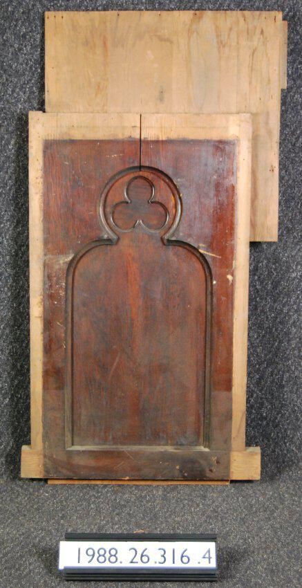 Interior wood panel. Originally part of church choir screen. Gothic revival style. Recessed panel with trefoil. Made of Douglas Fir. Varnished. Type: Inscriptions or Markings: Manufacturer: Place of Manufacture: Design motif: Style: Gothic Finish: Varnished
