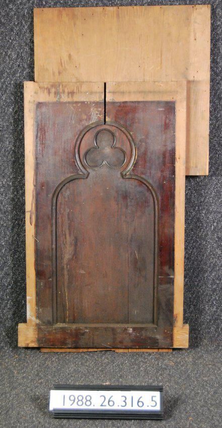 Interior wood panel. Originally part of church choir screen. Gothic revival style. Recessed panel with trefoil. Made of Douglas Fir. Varnished. Type: Inscriptions or Markings: Manufacturer: Place of Manufacture: Design motif: Style: Gothic Finish: Varnished