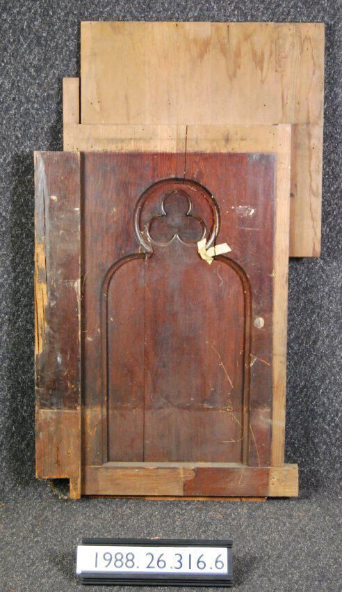 Interior wood panel. Originally part of church choir screen. Gothic revival style. Recessed panel with trefoil. Made of Douglas Fir. Varnished.