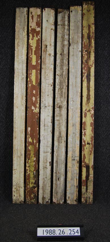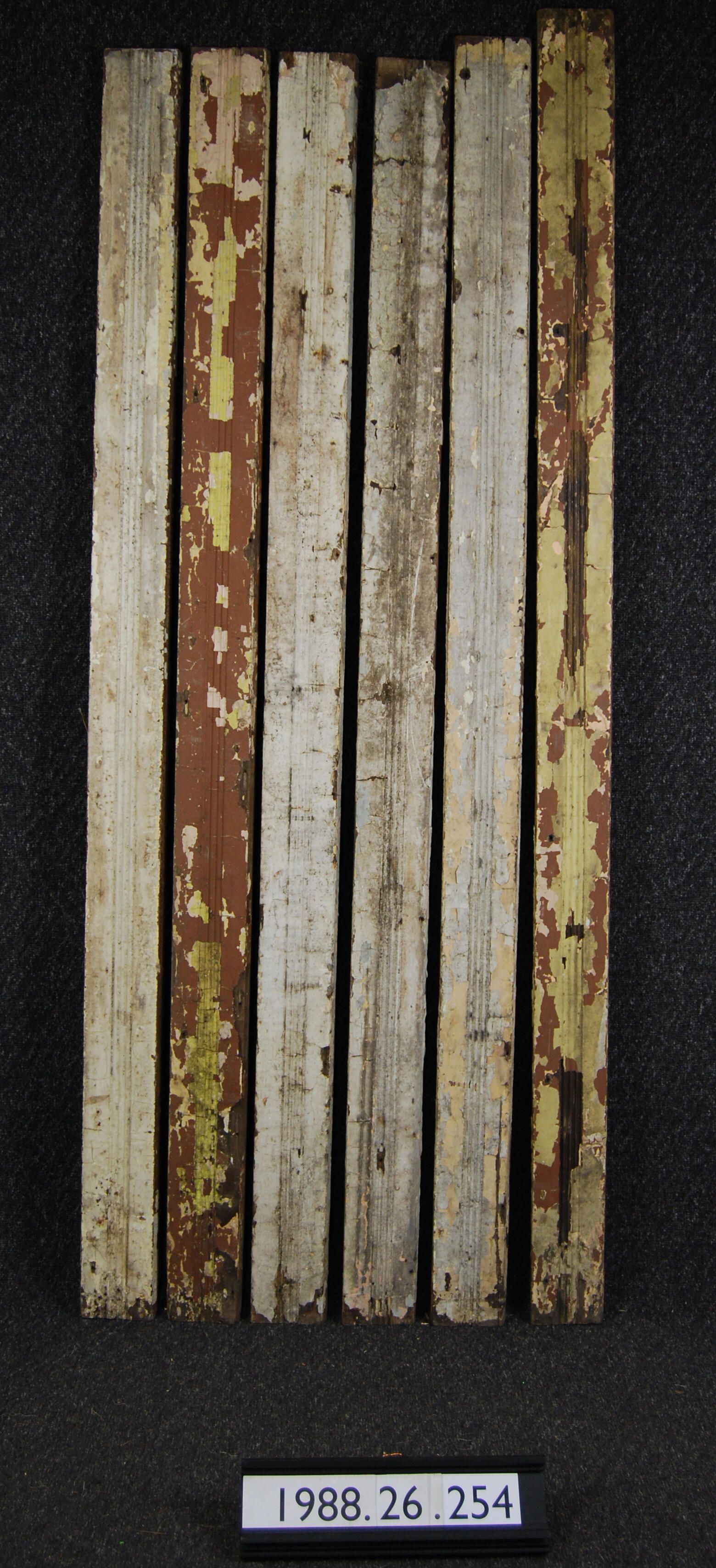 One lot of six Interior wood moldings (door or window casings). Made of soft wood. Originally varnished - now painted with multiple layers of peeling paint..