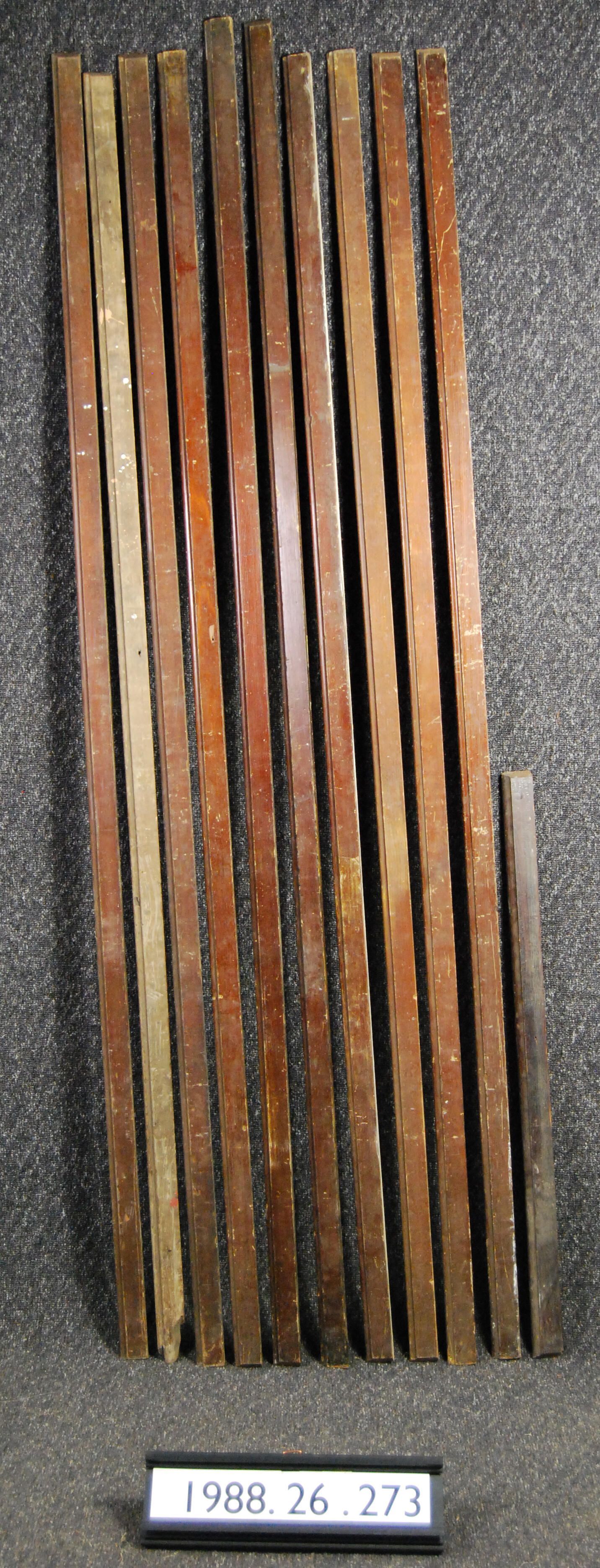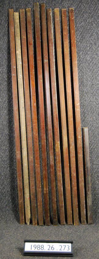 Eleven interior wood moldings. (Probably jamb strip). Made of soft wood. Varnished. Type: Inscriptions or Markings: Manufacturer: Place of Manufacture: Design motif: Style: Finish: Varnished