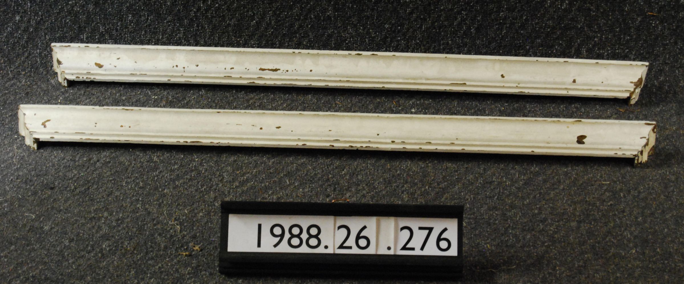 Two interior wood moldings. Each has return at both ends. Possibly once used as window or door header trim. Made of Ash wood. Originally varnished - now painted white.