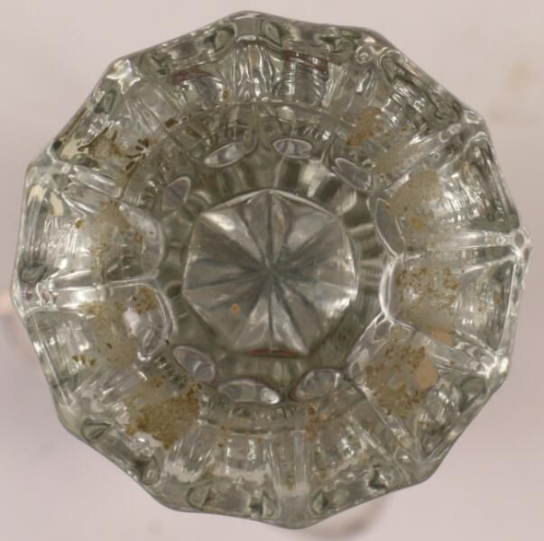 Construction: Press Glass Surface Texture: Smooth Surface Color/Finish: Clear Ornament: Design Name: School: Remarks: Each flute has a band of etched lines VDA Classification: Group & No: Comment: Catalog : The Antique Doorknob Maude Eastwood p. 34 #502 , p. 35 Material: Knob glass, shank wrought bronze with nickel. Manufacturing Method: