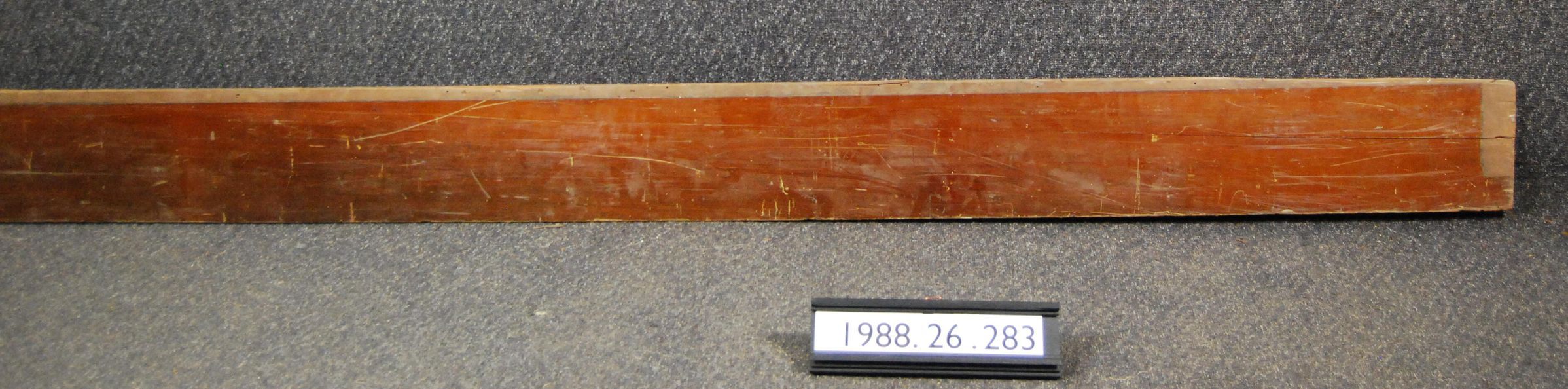 Interior wood board. One end split -- opposite end cut at angle. Original function undetermined. Made of soft wood. Varnished on one side.