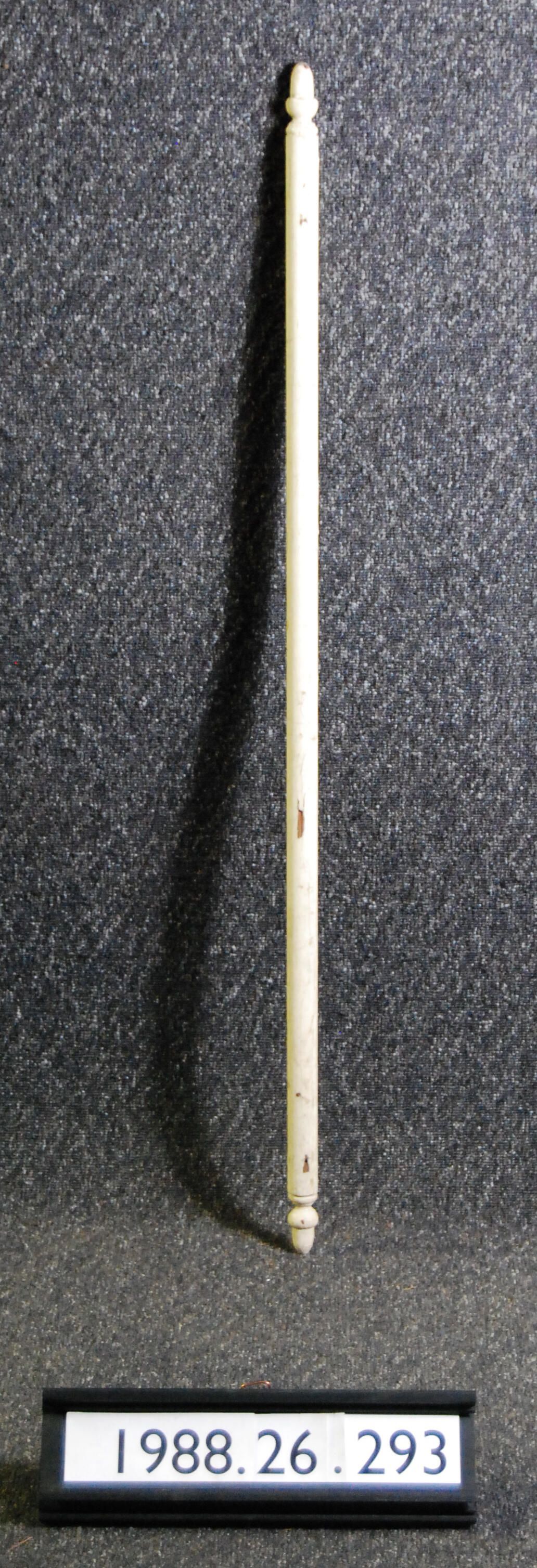 Interior wood corner trim. Turned. Has 90 degree "V" groove running along axis. Made of soft wood. Probably Douglas Fir. Originally varnished - now painted white.