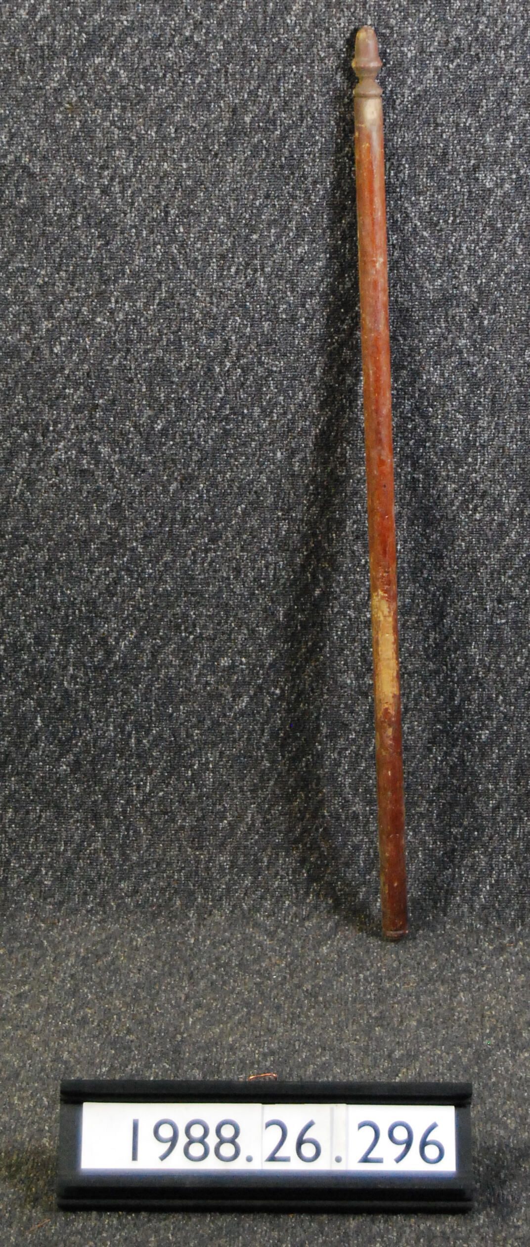 Interior wood corner trim. Turned. Has 90 degree "V" groove running along axis. One end is truncated. Made of soft wood. Probably Cedar. Varnished.