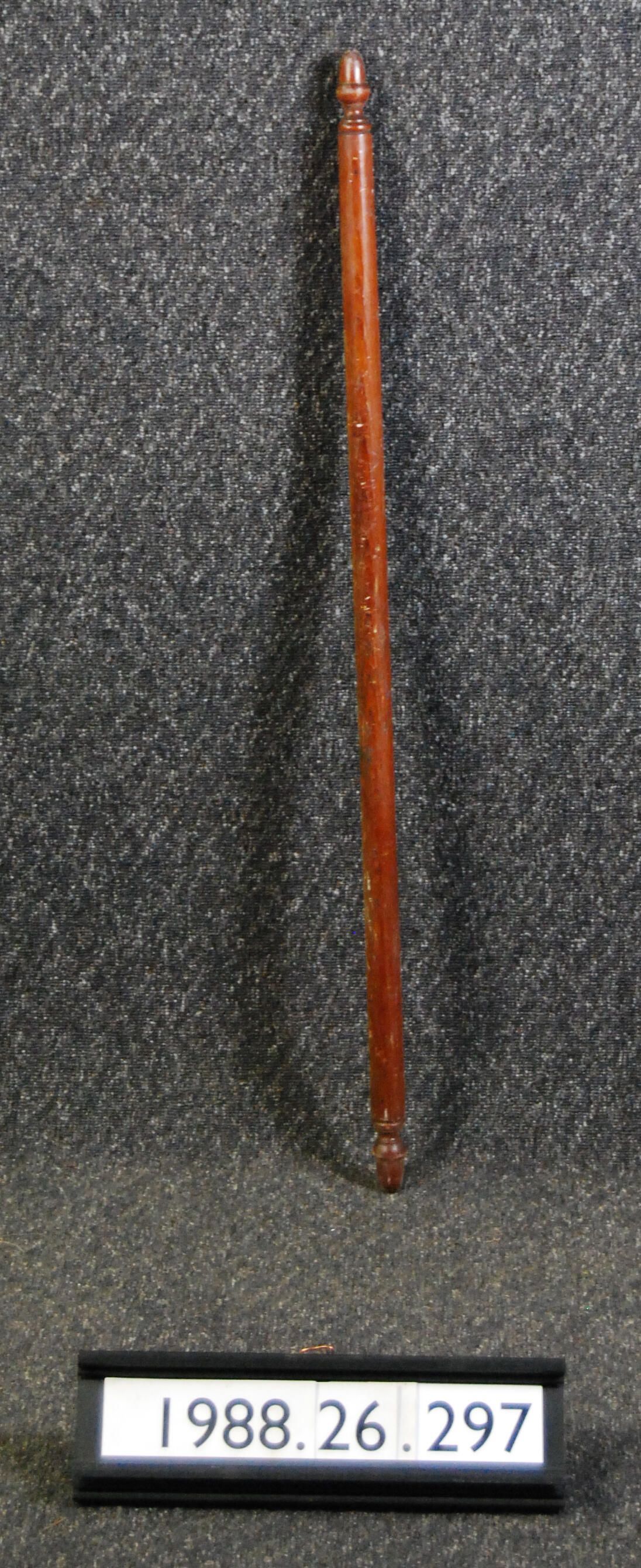 Interior wood corner trim. Turned. Has 90 degree "V" groove running along axis. Made of soft wood. Probably Cedar. Varnished.