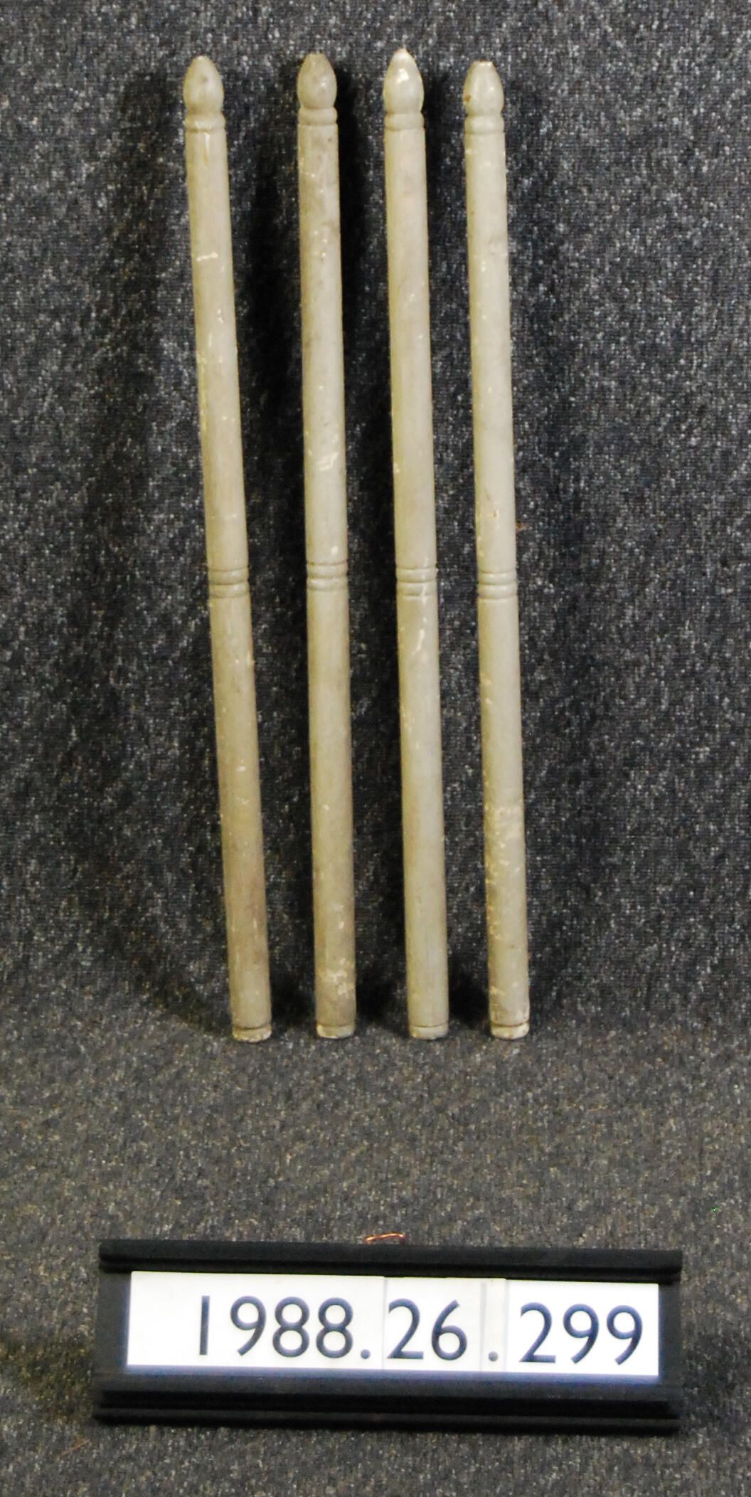 One lot of four interior wood corner trim pieces. Turned. Has 90 degree "V" groove running along axis. Made of soft wood. Painted grey.