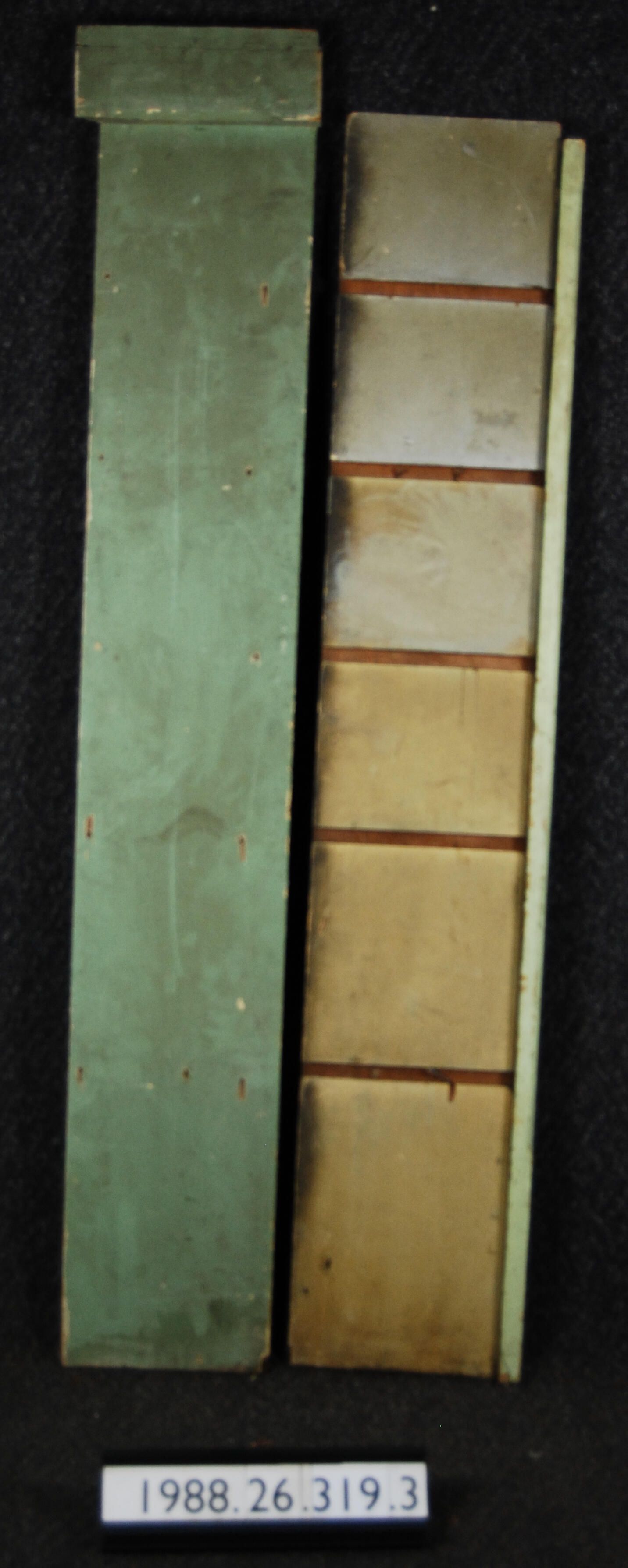 One lot of two interior wood (upright) shelf boards. Each has dado slots to support shelves. One board has face trim attached. Other board has end trim at the edge. Originally part of drug store shelves. Made of soft-wood. Painted green.