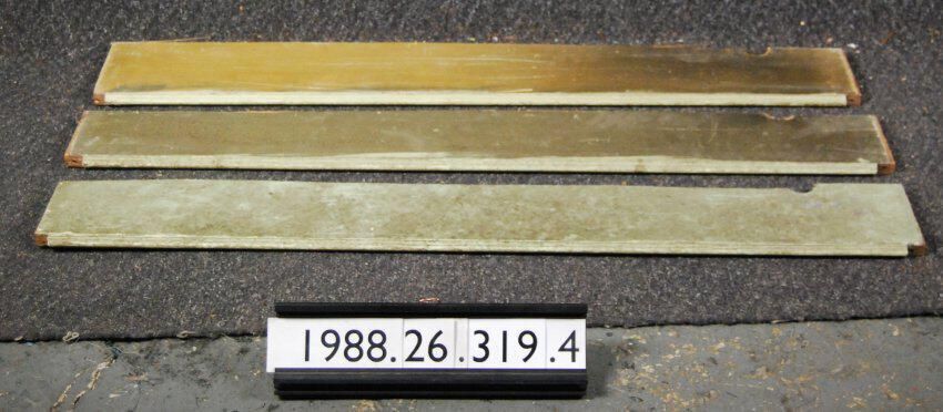 One lot of four interior wood shelves. Each has molding on front edge. Three shelves are truncated along axis, one shelf is complete.Originally horizontal shelf for drug store. Made of soft-wood. Painted green / brown. Note: fourth shelf found in collection and added to lot, but not photographed.