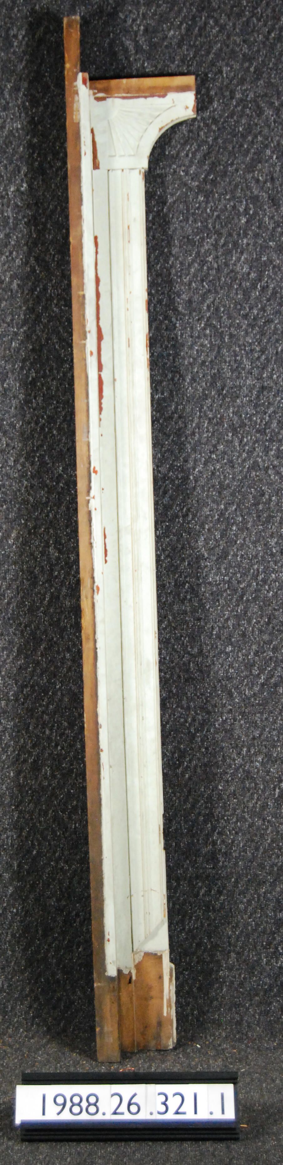 Interior wood trim comprised of molding. Attached bracket with carved fan motif. Attached at right angle to chamfired board. Made of hardwood. Painted green.