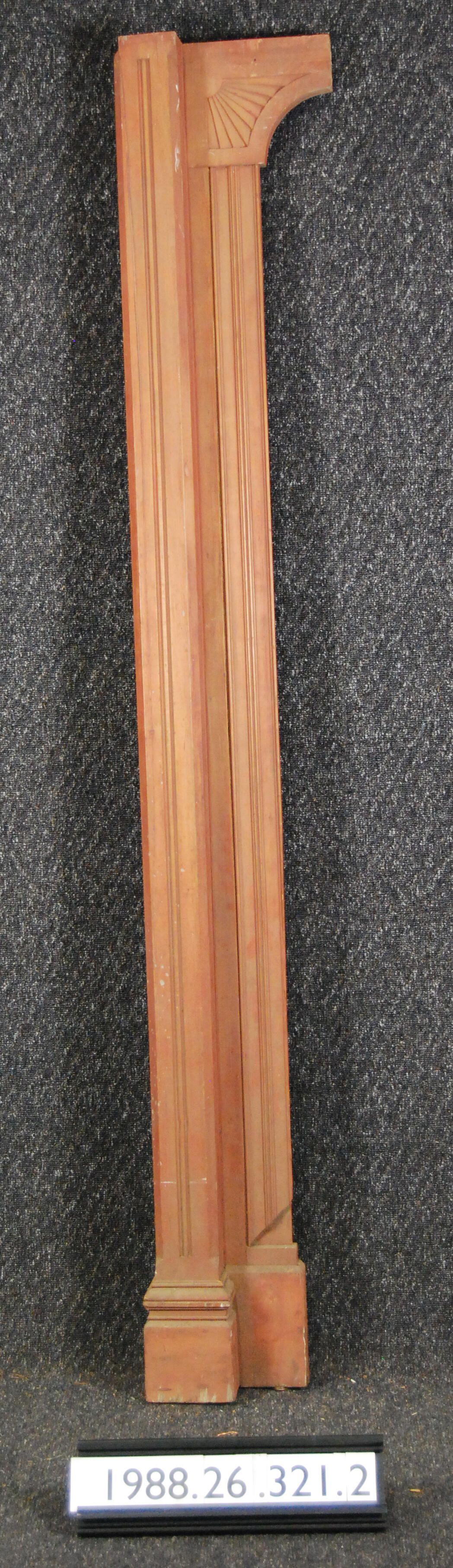 Interior wood trim comprised of column. Base molding. Edge molding. Bracket with carved fan motif. Made of hardwood with reddish stain - otherwise stripped of finish.