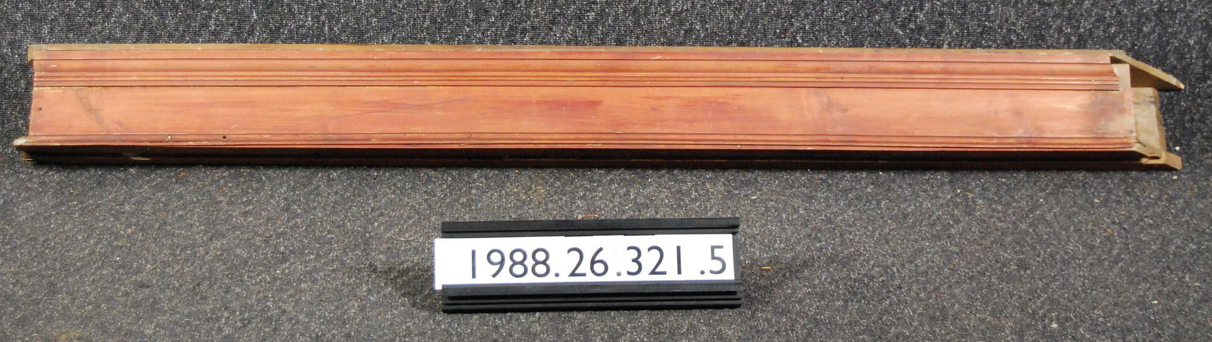 Interior wood trim. "Built-up" box configuration. Has face moldings (loose board). Top and bottom have dado grooves. Made of hardwood with reddish stain - otherwise stripped of finish.