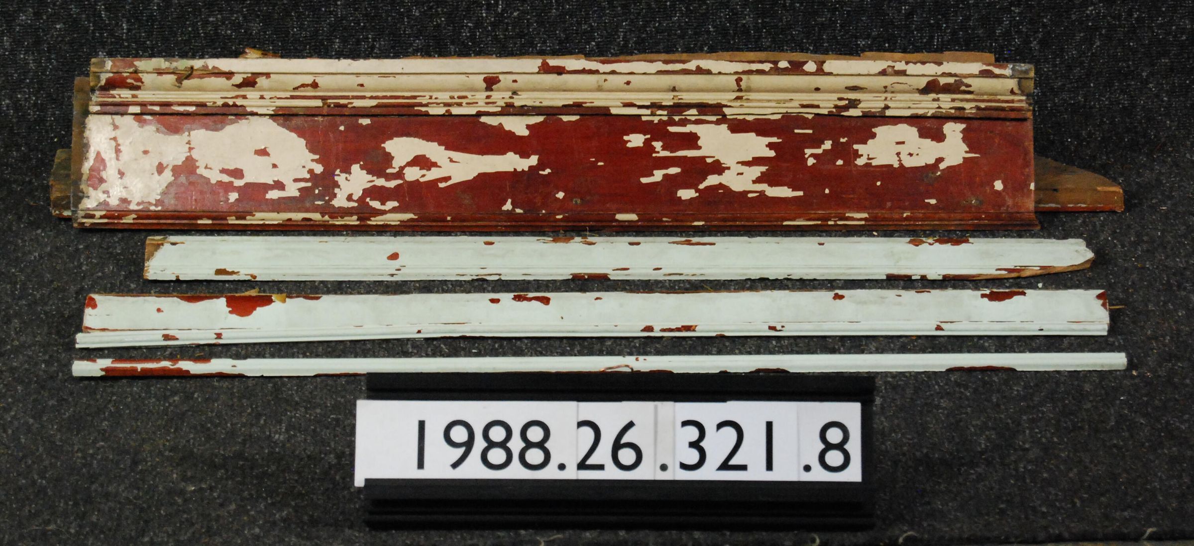 Interior wood trim. Originally of built-up box configuration (now disassembled). Top is missing. Bottom moldings and side molding detached. Made of hardwood. Originally with varnish and red stain finish - now painted green / tan.