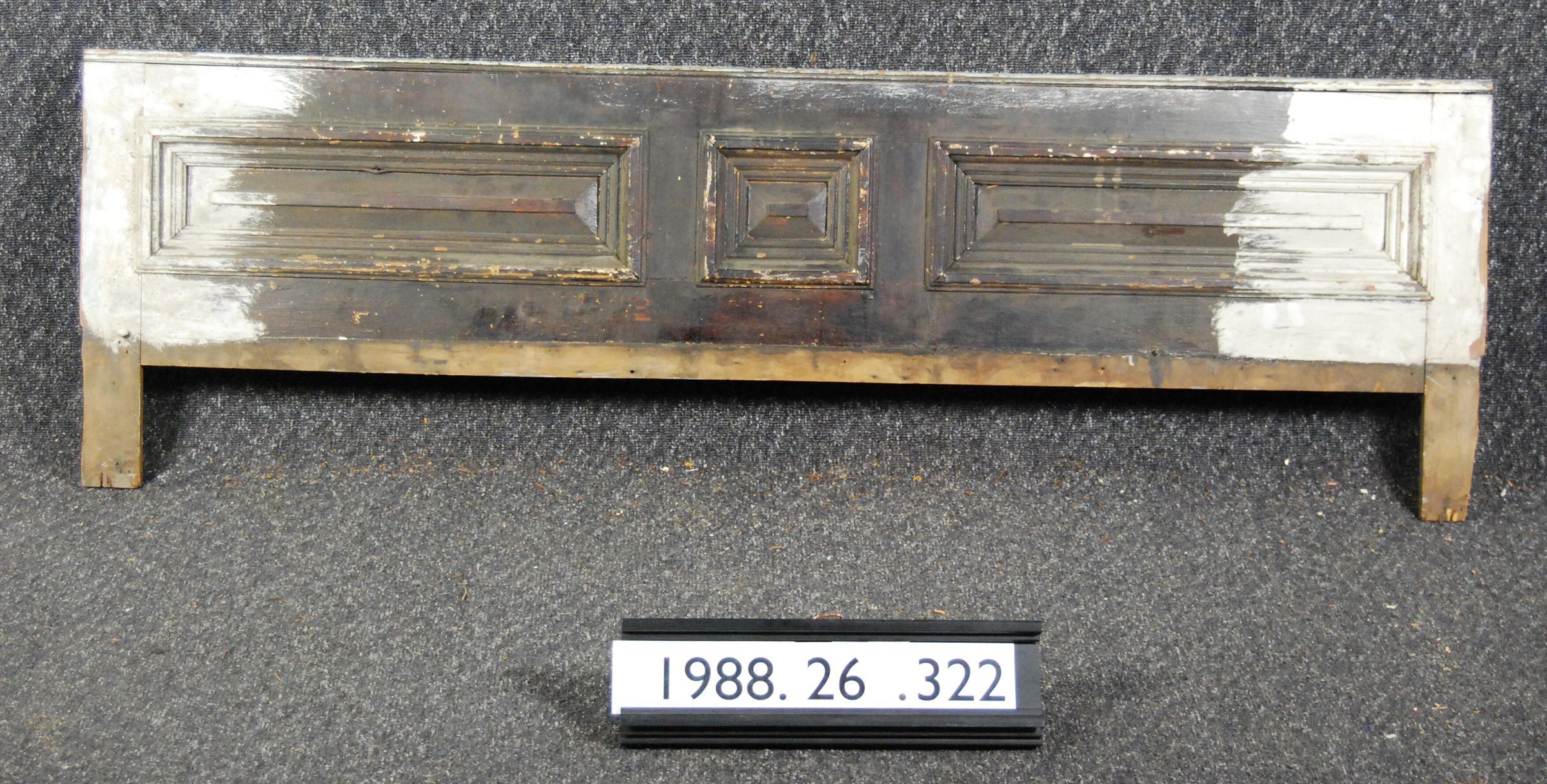 Interior wood panel. Has series of three recessed panels. Applied bolection moldings. Probably originally below window? Baseboard is missing. Made of hardwood. Originally varnished - now painted green / brown / off-white.
