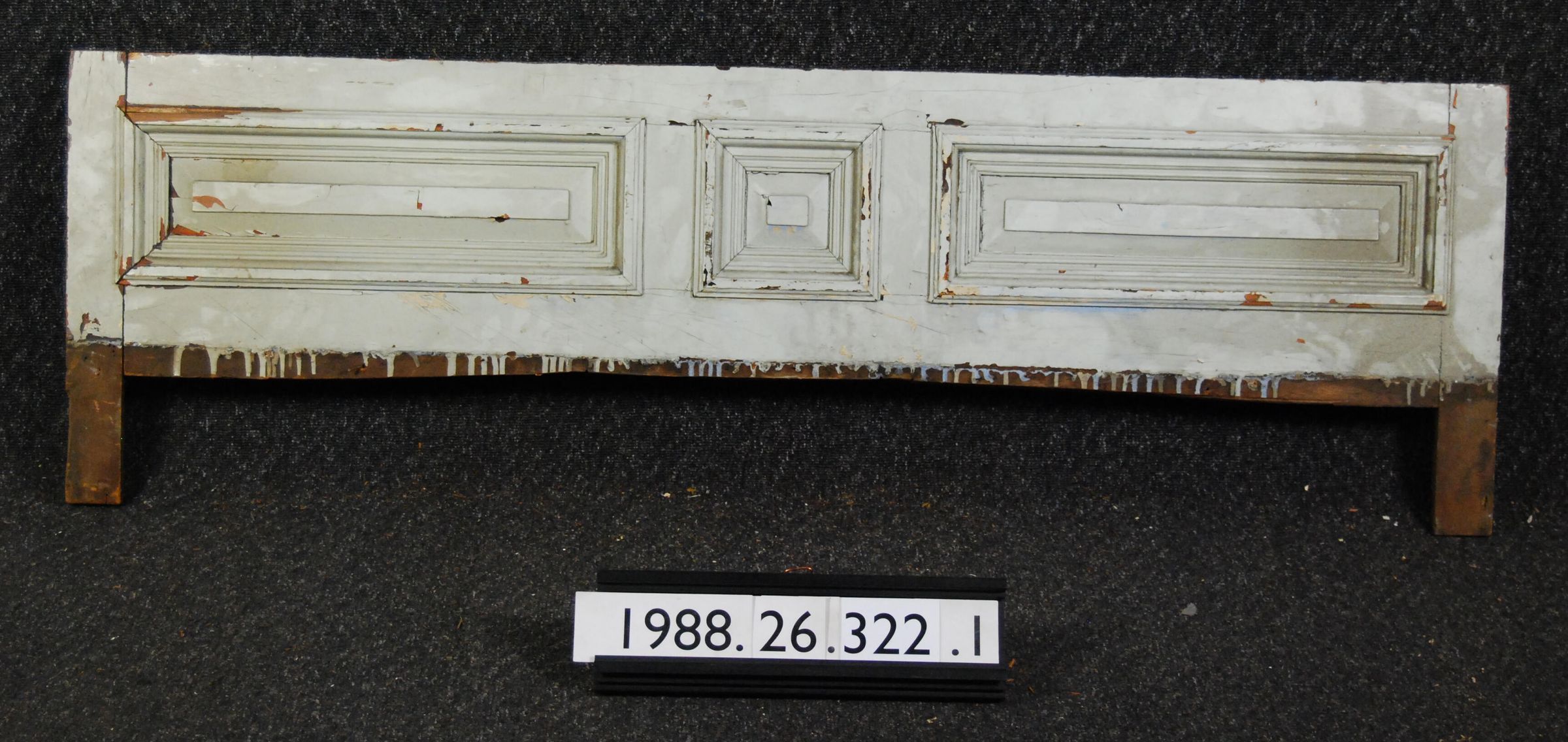 Interior wood panel. Has series of three recessed panels. Applied bolection moldings. Probably originally below window? Baseboard is missing. Made of hardwood. Originally varnished - now painted green.