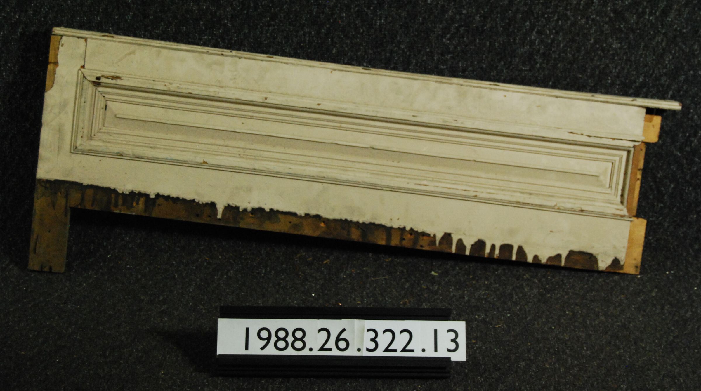 Interior wood single panel with applied bolection moldings. One stile, as well as baseboard moldings, are missing. Made of hardwood. Painted beige.
