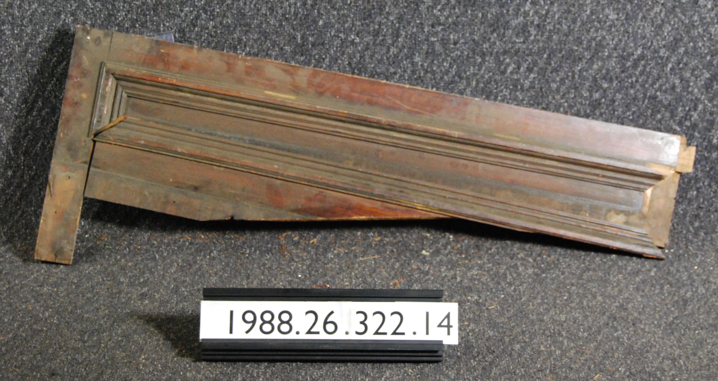 Interior wood single panel with applied bolection moldings. One molding, one stile, and portion of rail, are missing as well as baseboard moldings. Made of hardwood. Varnished.